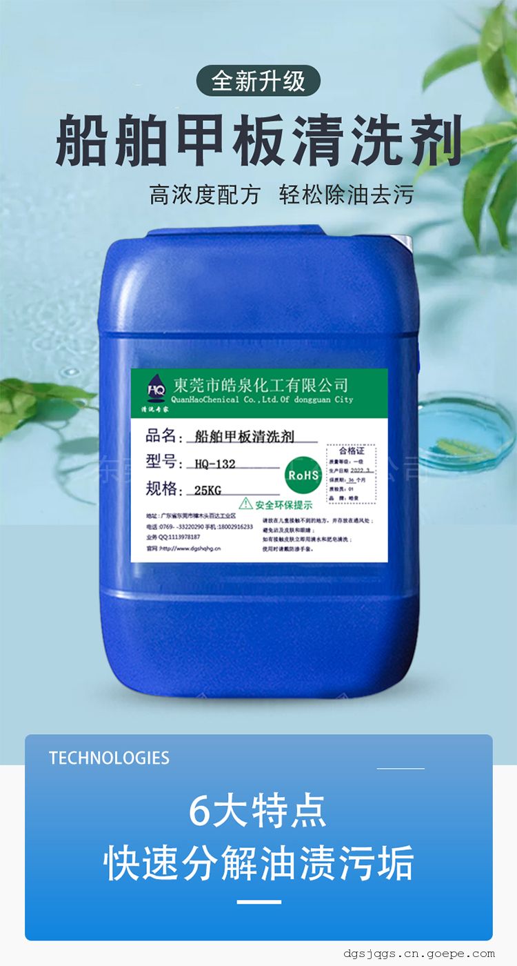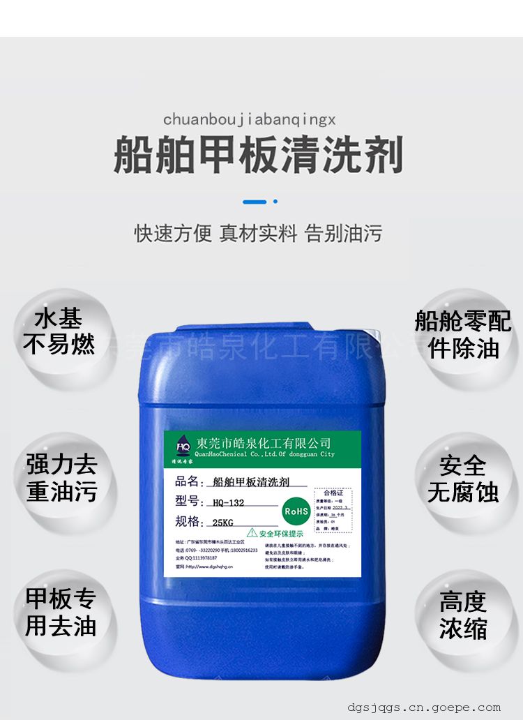 Dongguan city Haoquan Chemical Co., Ltd. R & D and production of plant microbial deodorant, metal oil stain cleaning agent, ship deck cleaning agent, motor train aircraft cleaning agent, ultrasonic cleaning agent, thermal oil carbon deposition cleaning agent, ground oil stain cleaning agent, kitchen range hood cleaning agent, aluminum oil stain cleaning agent, stainless steel oil stain cleaning agent, zinc alloy oil stain cleaning agent, copper oil and oxide removal cleaning agent, copper antioxidant, optical glass cleaning agent, optical glass deinking agent, photovoltaic panel cleaning agent, Glass curtain wall cleaning agent, metal rust inhibitor, neutral cleaning agent, alkaline cleaning agent, acid cleaning agent, heavy oil cleaning agent, mechanical equipment oil cleaning agent, circulating water cleaner, central air conditioning cleaning agent, sterilization agent, slime stripping agent, corrosion and scale inhibitor, passivation pre-film, boiler cleaner and other industrial cleaning agents.